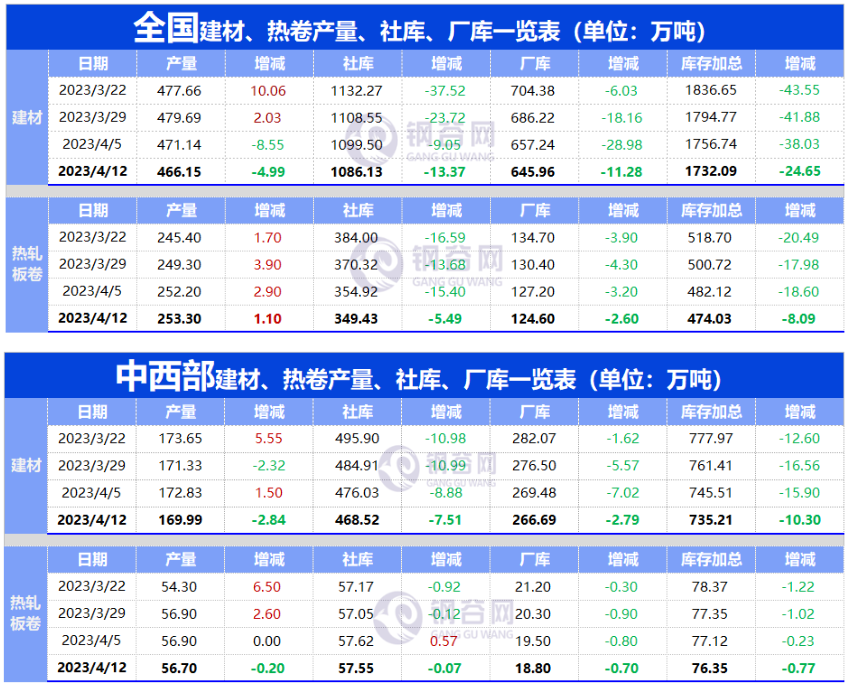 截至4月13日当周,中西部建材社库468.52万吨,较上周减少7.51万吨,下降1.58%;厂库266.69万吨,较上周减少2.79万吨,下降1.04%;产量169.99万吨,较上周减少2.84万吨,下降1.64%。