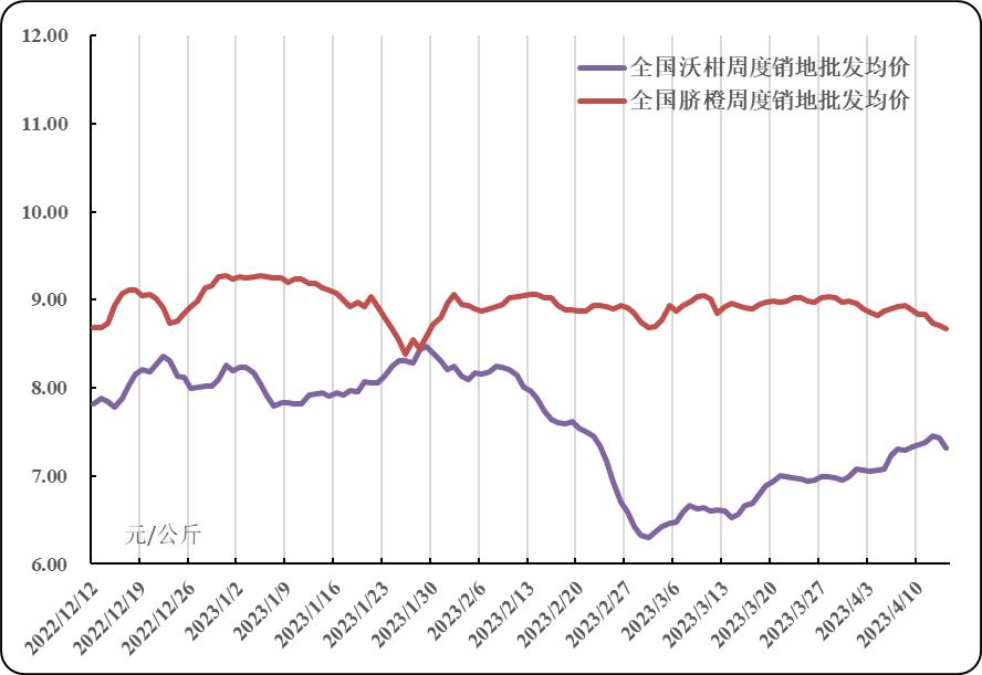 伴随低价埃及甜橙市占率大幅提升,全国脐橙销地批发价格震荡稳弱运行。同期偏甜的国内竞品沃柑销地批发价格稳步提升。截至4月14日,当周全国脐橙销地批发均价为8.68元/公斤,3月以来累计下跌0.78%;全国沃柑销地批发均价为7.32元/公斤,3月以来累计回涨15.87%。