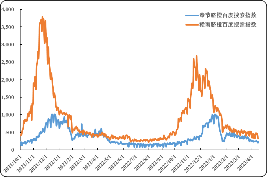 期间,国内本土脐橙供给持续缩量,百度搜索指数降至相对平缓区域。截至4月14日,当周奉节脐橙百度搜索指数均值为244.43点,周度环比仅下跌0.75%,周度同比下跌51.07%,自3月以来累计下跌36.93%。同期,奉节脐橙产地收购均价报6.62元/公斤,自3月以来累计上涨19.93%;秭归脐橙产地收购均价报7.69元/公斤,自3月以来累计上涨49.86%。