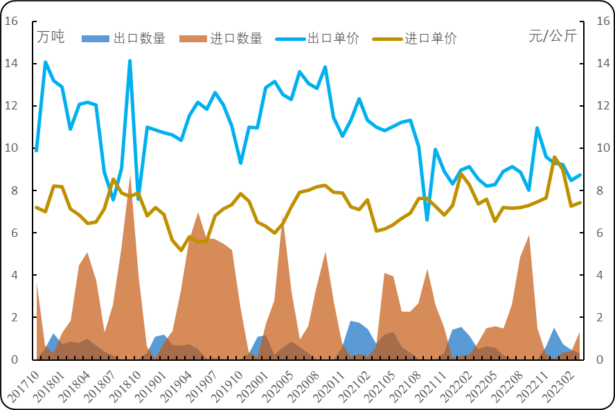 3月国内本土甜橙(三峡库区脐橙)供应继续缩量,尤其奉节脐橙销售量逐步缩减且价格波幅增大,进而国内甜橙出口量走低且出口单价上行,同期进口甜橙体量大增且价格上浮。国家海关总署数据显示,3月国内本土甜橙出口量达0.33万吨,环比下跌29.13%,同比下跌34.24%;同期国外甜橙进口量达1.33万吨,环比上涨231.28%,同比亦上涨66.89%。3月进口埃及甜橙0.89万吨,环比上涨243.32%,同比上涨83.20%,占当月进口总量比重提升了5.95个百分点;进口均价则为5.52元/公斤,同比仅上涨4.42%。