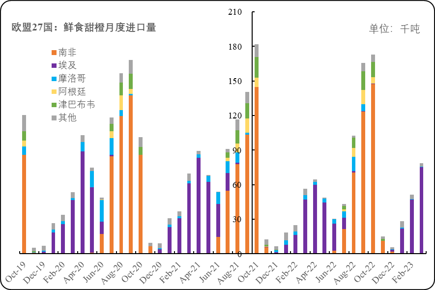 3月,欧盟本土中熟甜橙(脐橙)供应趋紧,低价埃及甜橙进行补位。鉴于土耳其、摩洛哥、突尼斯等甜橙产量缩窄,埃及甜橙在欧盟市占率进一步提升。具体来看,2023年4月5日,欧盟委员会官方网站发布报告显示,3月欧盟进口甜橙7.88万吨,环比上涨53.67%,同比上涨39.76%。其中,进口埃及甜橙7.53万吨,同比上涨59.41%,进口份额同比上涨11.78个百分点;进口摩洛哥甜橙仅0.06万吨,同比下跌83.89%,进口份额同比下降5.45个百分点。
