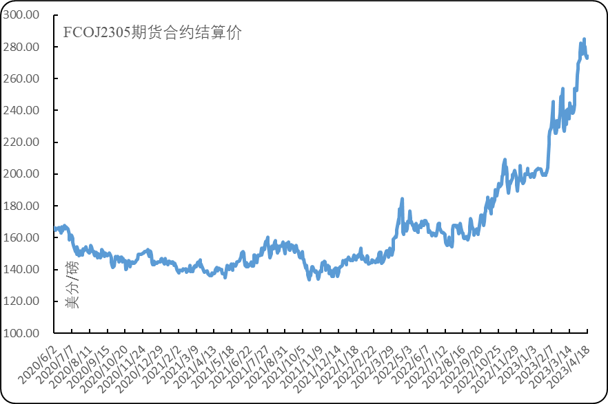 图3.全球冷冻浓缩橙汁(FCOJ2305)期货合约结算价走势图
