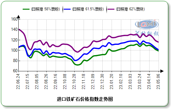 新华财经北京5月6日电 本周(5月1日-5月6日当周)进口铁矿石价格指数呈现继续下跌态势。据兰格钢铁网监测数据显示,截至2023年5月5日,58%澳粉指数99美元/吨,较上周同期下跌1美元/吨;61.5%澳粉指数101美元/吨,较上周同期下跌1美元/吨;62%澳块指数116美元/吨,较上周同期下跌2美元/吨。