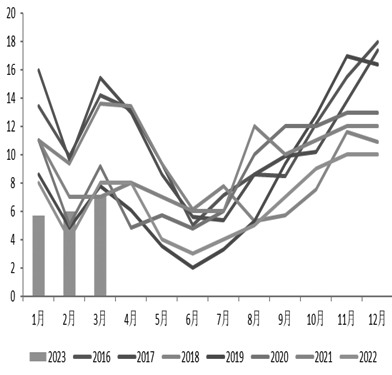 苹果期货上市以来的统计数据显示,10月合约在4月大概率以上涨为主,背后更多是极端天气可能对苹果产量造成影响,该时间段对应的是苹果树非常重要的开花坐果过程,对天气非常敏感。10月合约在5月有涨有跌,但6月基本以下跌为主。因此,从交易角度来看,若5月价格拉高,则正好是做空的好时机。5月下旬,各苹果产区陆续进入套袋期,套袋量是衡量苹果产量最关键的指标,主要产区套袋之后,市场对新季苹果产量才会有初步认识。6月,供应端炒作接近尾声,苹果市场将再次回到现货需求主导,期价才可能会有像样的下跌。