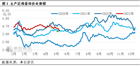 2021年至2023年一季度,主产区蛋价多处于相对高位,但2023年二季度开始,价格跌势较明显,且已明显低于去年同期水平,部分甚至低于2021年同期。截至5月25日,全国主产区鸡蛋均价为4.39元/斤,较一季度末下跌8.93%,较去年同期下跌8.20%,主要原因是供需关系发生转变。