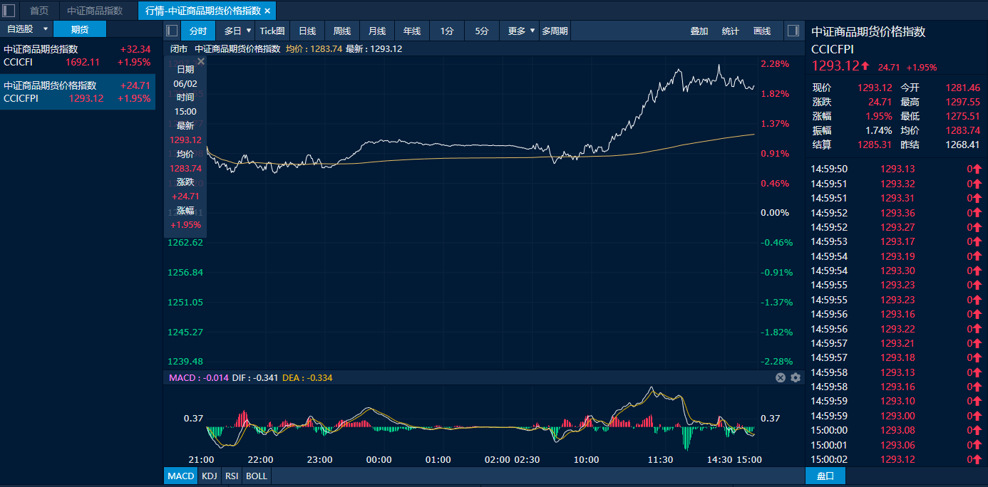 国内商品期货市场6月2日大面积上涨。截至下午收盘,追踪国内商品市场的中证商品期货价格指数收报1293.12点,较前一交易日上涨1.95%;中证商品期货指数收报1692.11点,较前一交易日上涨1.95%。