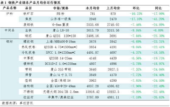 5月钢铁产业链产品价格走势以震荡下行为主,分析价格下跌原因主要有:一是成本下移驱动。统计显示,5月钢材原料跌幅在7%之上,成本推动价格下跌。二是下游需求表现不佳,整体需求释放缓慢,促使价格下跌。三是市场宏观消息面复杂,美联储表示加息尚未结束,对市场心态有利空影响,价格下跌。