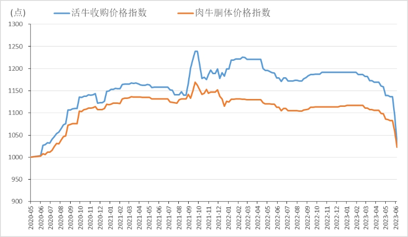 截至2023年6月7日,阳信活牛收购价格指数报1030.80点,环比(2023年5月8日,下同)下跌9.55%;阳信肉牛胴体价格指数报1022.26点,环比下跌5.81%。