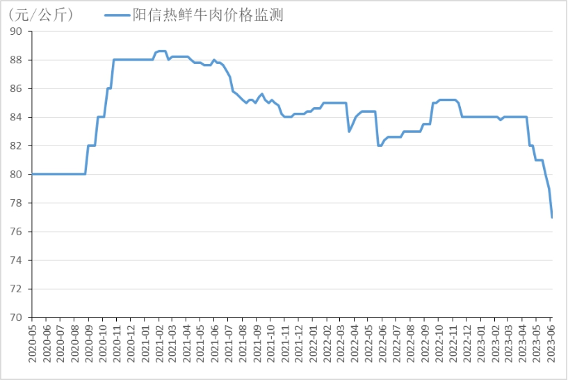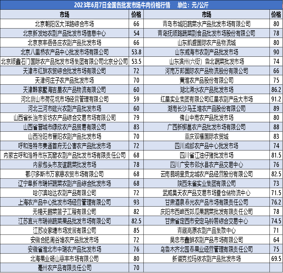 具体价格方面,截至2023年6月7日,阳信活牛收购均价报31.90元/公斤,环比下跌3.37元/公斤;肉牛胴体均价报61.25元/公斤,环比下跌3.77元/公斤。