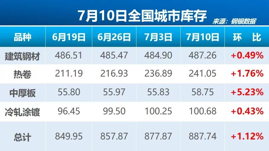 钢银电商10日公布数据显示,截至7月10日的一周,全国39个城市,共计146个仓库的城市钢材总库存量为887.74万吨,较上周增加9.87万吨,增幅1.12%。其中建材库存较上周增加2.36万吨,增幅0.49%。