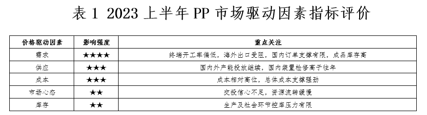 2023年上半年国内PP市场呈现震荡下行趋势,主要因为强预期遭遇弱现实叠加新增产能释放影响,PP在3月份开始进入下滑通道,随后需求端动力不足占据上风叠加成本支撑减弱,PP在5、6月份加速下跌并创三年来历史新低。
