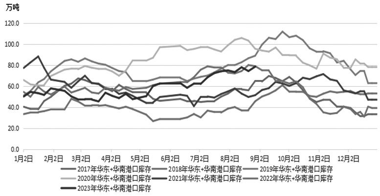 图为2017—2023年华东和华南港口甲醇库存走势