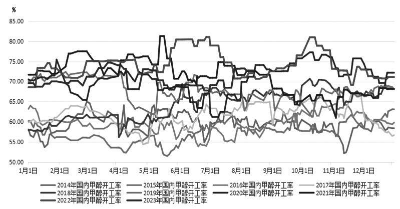 图为2014—2023年国内甲醇开工率走势