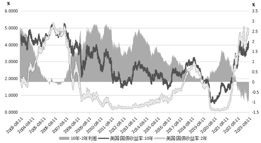 图为美国10年期和2年期国债收益率及价差走势