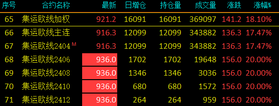 数据显示,集运指数(欧线)期货首批上市交易EC2404、EC2406、EC2408、EC2410和EC2412共5个合约,挂牌基准价均为780点。当日主力合约EC2404开盘价770点,收盘价916.3点。该品种全天成交36.9万手(单边,下同),成交金额165.6亿元,持仓1.6万手。从市场表现看,主力合约EC2404涨幅达到17.47%,其他四个合约集体涨停,涨幅为20%。