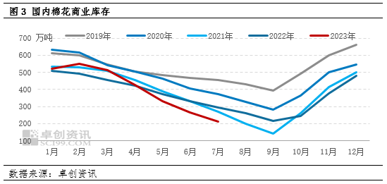 随着加工收尾,棉花去库存进度加快。卓创资讯监测数据显示,截至7月底,全国棉花商业库存降至211.66万吨,处于近5年同期最低位,库存偏低,且优质资源越来越少,下游纺织企业对进口棉的需求增加。