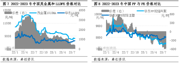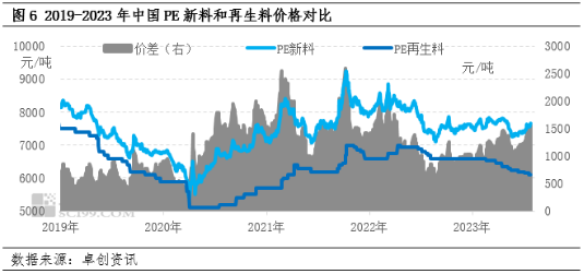 PE的替代品方面,首先PE新料跟再生料互为替代关系,两者具有相似的下游用途,一般来说,价差较大的情况下,下游工厂会因节约成本增加对PE再生料的采购;而价差较小时,下游工厂考虑到提升产品性能会重点采购PE新料。在实际生产中,下游工厂可根据产品特点进行选择,在部分领域PE再生料具有一定价格优势,但在更多生产领域中,因再生料质量不如新料,PE新料仍具有不可替代性。