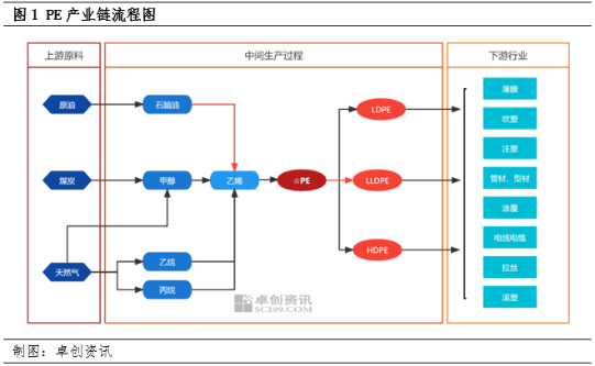 目前国内PE的原料已经实现原油、煤炭、甲醇和天然气共存的局面。作为身处产业链中端位置的PE产品,上游原料价格波动传导主要从成本及心态方面对PE产品形成影响。PE产品下游应用广泛,下游行业需求表现积极与否一定程度上影响PE行情的变化。