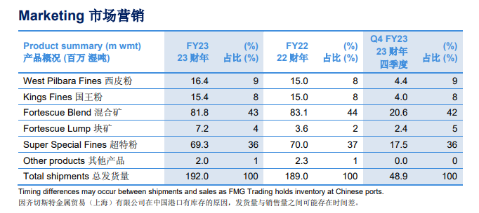 2023财年四季度的平均销售价格为96美元/干吨,为普氏62%CFR平均指数价的87%,2023财年的平均销售价格为95美元/干吨。