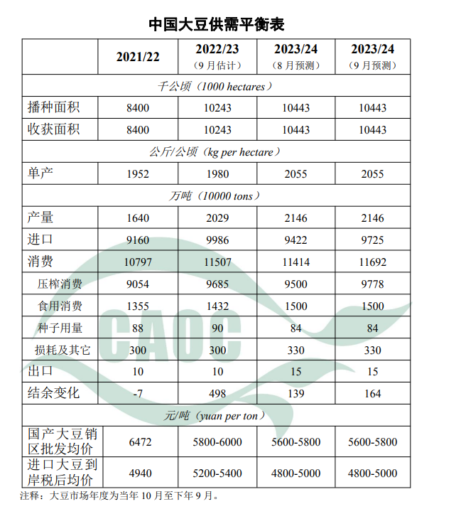 新华财经北京9月12日电 农业农村部市场预警专家委员会12日发布了9月中国农产品供需形势分析。其中在大豆方面,在本月预估中,农业农村部预警专家上调了对2022/23年度中国大豆进口和压榨消费量的预估,并表示本年度全球大豆供需总体宽松,但受新季美豆关键生长期内遭遇高温,作物优良率下降等因素影响,全球大豆价格保持相对高位,再加上人民币兑美元汇率下降,进口大豆成本增加。