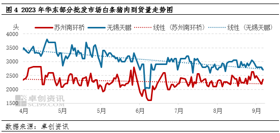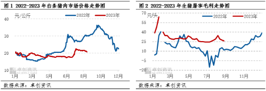 2023年以来,养殖集团出栏量充足,生猪供应充沛,导致猪肉供应亦增多,价格持续低位。仅在7月底因二次育肥热度较高,供应收紧支撑猪肉价格快速反弹,涨至年初至今最高值22.49元/公斤,但随后业者乐观情绪降温,猪肉价格继续震荡小幅回落,截止到9月11日,全国瘦肉型白条猪肉价格为20.83元/公斤,较最高值下降7.38%。白条肉价格反弹乏力,宰量难提,屠宰企业头均分摊成本抬升,屠宰毛利亦持续低位,根据卓创资讯数据监测,截止到9月8日,全国屠宰毛利均值为26.92元/头,年内多数时间维持在25-30元/头之间,屠宰企业持续亏损。