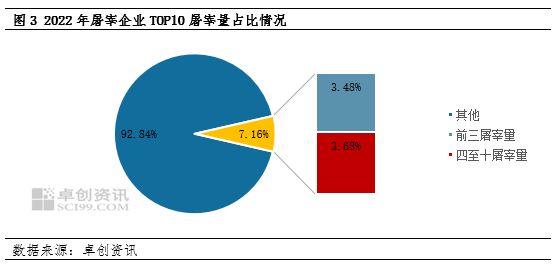 据卓创资讯调研数据显示,2022年TOP10生猪屠宰企业屠宰量占比下滑至7.12%,进而表明屠宰行业集中化程度较低,与之相对应的养殖行业规模化程度已达到25%。同时由于前期部分养殖企业大举进入下游屠宰行业,如牧原、天邦、温氏等均在不同区域建立相匹配的屠宰厂,自身养殖产能可直接进入下游屠宰,一定程度上缩减人力、物流等成本,从而导致其白条猪肉出厂有一定的价格优势,进而对传统的屠宰企业形成一定压力,企业逐渐“内卷”。