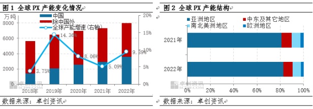 近10年全球PX产能增长较为稳定,总体处于上行周期,主要集中在亚洲尤其是中国地区。2019年以来随着大量项目尤其是中国多个民营大炼化项目的投产建成,PX产能获得大幅度提升,2022年全球产能约为8015万吨。从全球PX产能装置的分布上来看,亚洲产能占比遥遥领先,占据绝对主导地位。2022年亚洲产能为6613万吨,占全球产能的比例为82.5%;亚洲内部来看,PX产能主要分布在中国、韩国、印度、日本等地区和国家。