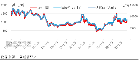 人民币价格为国内生产企业公布的月度挂牌价及结算价,挂牌价格在每月最后一个工作日公布,作为下个月企业预收款指导价,结算价通常在每月22-24日公布,主要应用于企业与下游的合约结算方面。虽然企业公布月度价格,但是企业通常参考日度美元市场价格的月均价格,从上图可以看出美元价格与人民币价格走势相对趋同。因此,日度美元市场价格市场关注度更高。