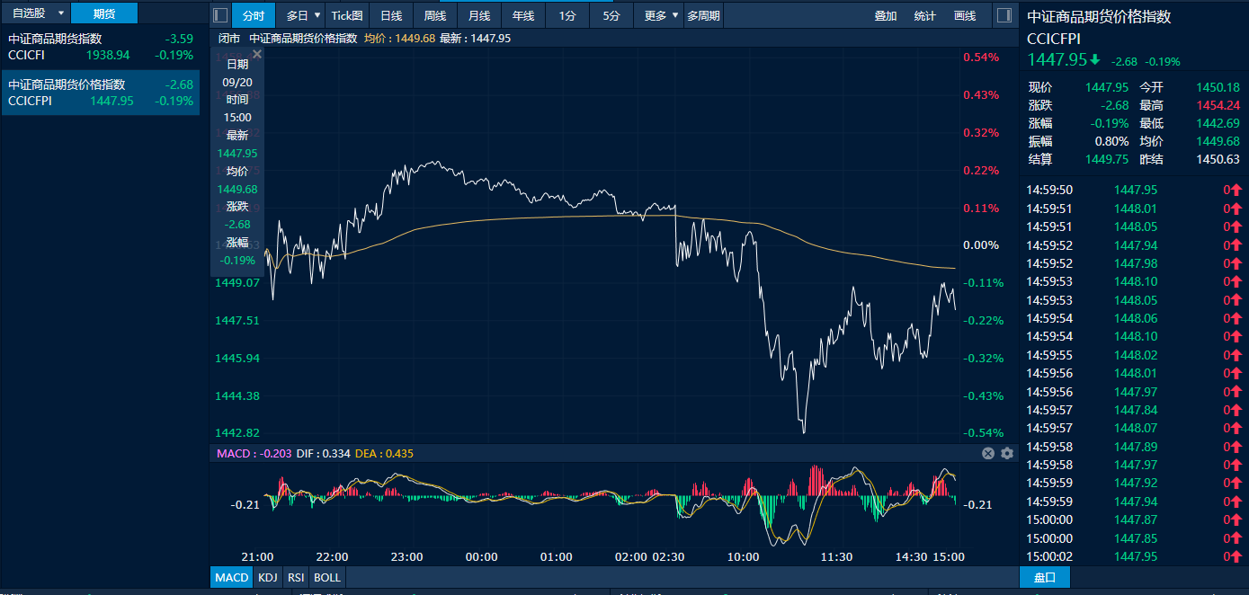 截至20日下午收盘时,追踪国内商品市场的中证商品期货价格指数收报1447.95点,较前一交易日下跌0.19%;中证商品期货指数收报1938.94点,较前一交易日下跌0.19%。