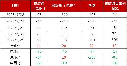 钢材利润方面,9月份国内钢厂亏损情况有所增加,建筑钢材继续亏损,而部分板材品种亦由小幅盈利转为亏损。截至9月28日,找钢网调研的高炉和电炉钢厂螺纹钢吨钢生产利润分别为-63元/吨和-220元/吨,月环比分别下降84元/吨和上升19元/吨;高炉钢厂热轧板卷吨钢生产利润为-108元/吨,月环比下降200元/吨。