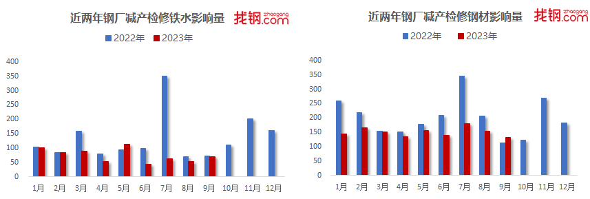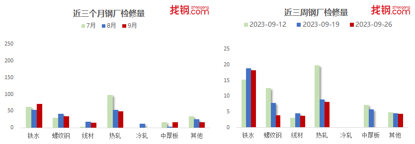 从钢厂减产检修情况来看,9月份检修钢厂数量较8月份继续减少,并且同比来看目前钢厂减产力度小于去年同期,分品种来看,9月份国内钢厂螺纹钢检修及转产力度加大,热轧板卷等板材品种检修力度较小。据找钢网不完全统计,9月份国内有33家钢厂有检修/计划检修,其中检修影响铁水58.18万吨,螺纹钢33.65万吨,线材15.74万吨,热轧48.52万吨,中厚板16.1万吨,其他16.66万吨。