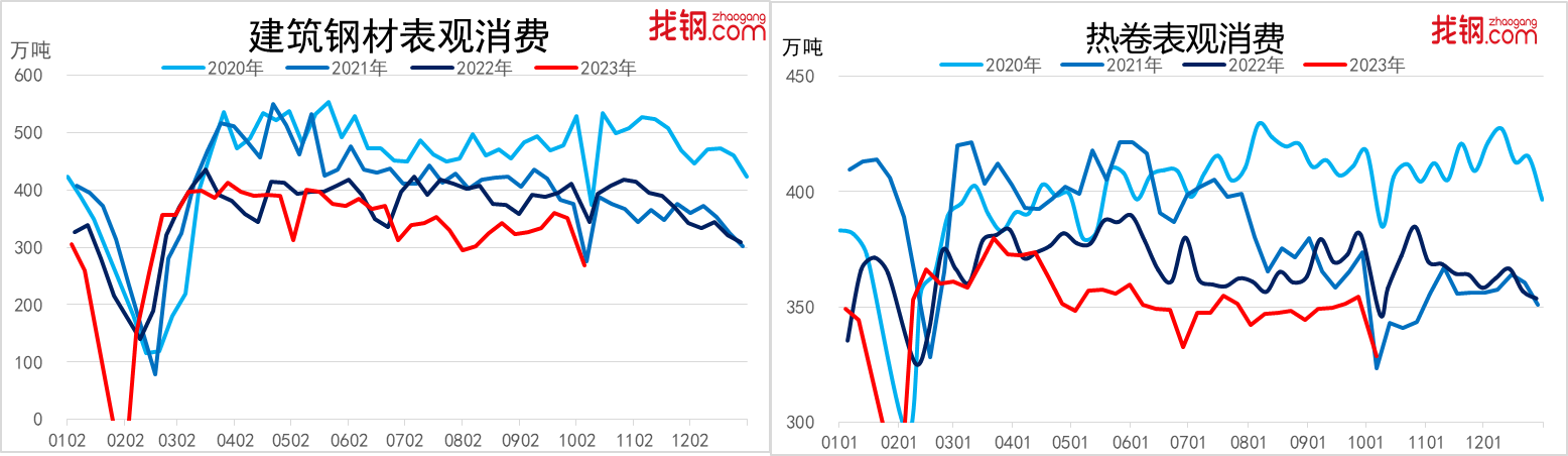从钢材表观消费来看,截至10月6日,找钢网跟踪调研的建筑钢材表观消费量268.14万吨,月环比下降58万吨,环比降幅17.8%;热轧板卷表观消费量328.64万吨,月环比下降20.48万吨,环比降幅5.9%。目前来看,受国庆长假影响,短期钢材消费出现明显下滑,随着假期结束,10月中下旬钢材消费有望迎来恢复性增长。