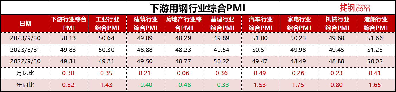 就10月市场而言,进入4季度,部分终端企业存在赶工期诉求,同时考虑到国内稳增长政策不断发力,预计10月份下游行业PMI综合指数或仍有一定的回升空间,但考虑到出口高位继续增长动能减弱,预计10月份下游行业景气度回升空间或有所收窄。