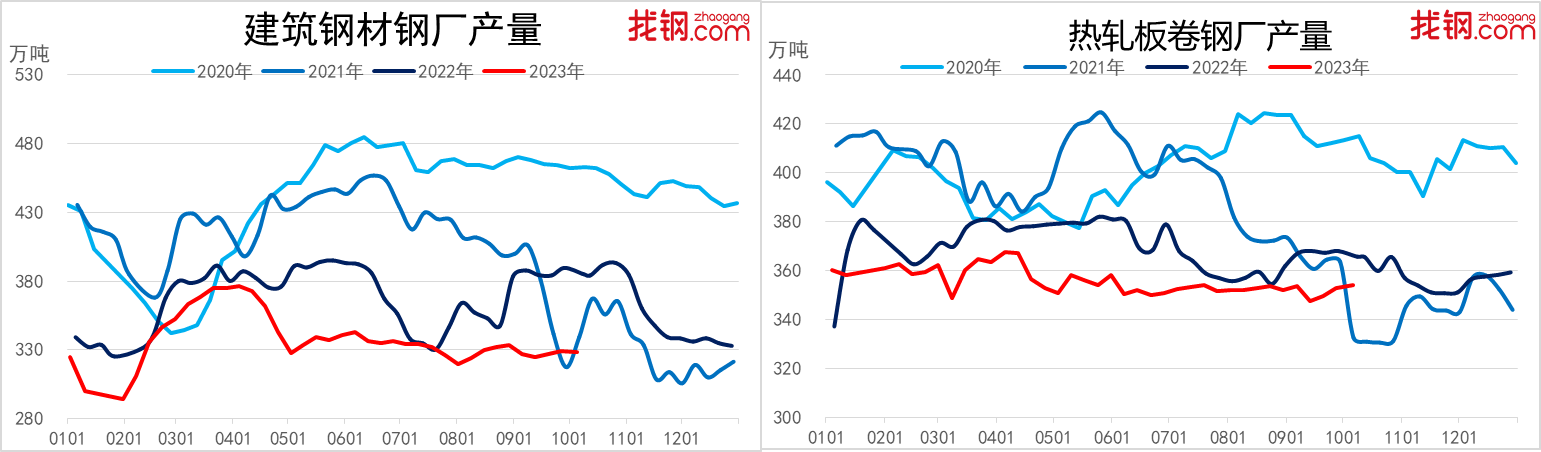 钢材生产方面,截至10月6日,找钢网跟踪调研的国内钢材周度总产量为794.54万吨,月环比下降2.08万吨,环比降幅0.3%。