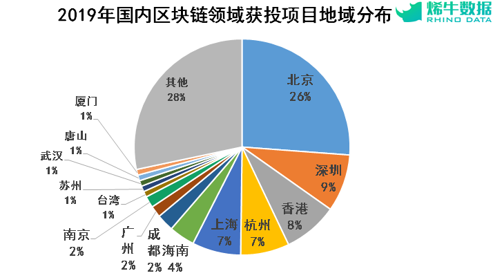 从获投项目地域分布来看,烯牛数据发现北京以61笔融资蝉联榜首,北深港杭沪位列第一梯队,一线城市的政策、人才、资源支持带动了当地的区块链产业发展。2019年中央和地方政府加强监管后,香港台湾的区块链项目占比上升,其较为宽松的地方政策更受创业团队青睐。