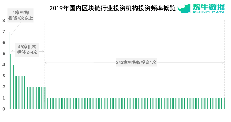 从投资机构角度来看,烯牛数据显示共有292家机构参与了2019年国内的区块链行业股权投资。其中,243家机构仅出手1次,占总机构数的83.2%;剩余的49家投资机构中,投资频数2-4次的机构共45家,仅有4家机构投资数大于4次。