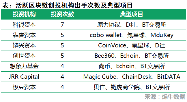 活跃机构(出手次数在4次及以上)间存在不少合投项目,如BT交易所、氪星球、Echoin、D社等,分摊了风险的同时也共享了机构资源。