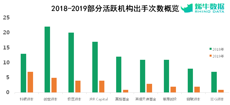 2018年出手次数超过10次的18家机构中,2019年仅科银资本、创世资本、JRR Capital、极豆资本等4家机构出手次数在4次及以上,机构出手次数大幅缩减,出手相对而言更加谨慎。活跃机构多为新兴区块链投资机构,传统VC中,2018年较为活跃的机构,如IDG资本、真格基金、策源创投、英诺天使基金、启赋资本,2019年也大幅减少出手次数。