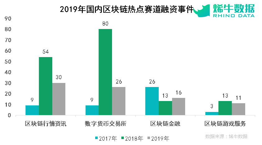 2019年度,区块链细分领域中,区块链行情资讯、数字货币交易所、区块链金融、区块链游戏服务等领域披露融资事件数最多。其中,数字货币交易所领域融资事件数同比降幅最大,区块链金融领域融资事件数同比稍有上升。