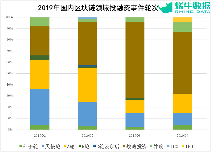 从融资阶段来看,区块链行业的融资以战略投资为主,2019年全年早期融资(种子轮8起/天使轮46起/A轮52起)占总融资事件数的43.3%,早期融资所占的比重在逐渐减少,A轮及之前轮次的占比由年初的62.0%降至第四季度的31.9%;相对的,战略投资、并购的比重大幅上升。