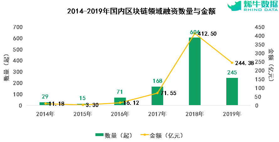 根据烯牛数据统计,2019年国内区块链领域投资热度大幅回落,共披露245起融资事件,相比2018年下降59.4%,总融资额达244亿元,相比2018年下降40.8%,涉及项目212个。融资数量、金额双降,相比2017年仍是大幅增长,在政策推动以及更理性的资本支持下,2020年国内区块链领域或将迎来更为健康的发展。