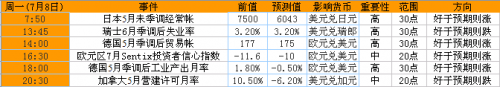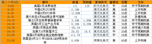周二风险事件不多,市场关注点主要将集中在中国和英国的经济数据方面。其中中国将公布重要的CPI和PPI两项通胀数据。目前机构暂时还没给出预期,不过从6月份PMI表现来看,CPI和PPI仍将保持在较低水平运行。