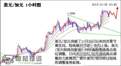 美元/加元日线图在均线系统的依托作用下延续了区间内向上节奏,美元/加元中期进一步向上测试1.0610阻力作用,一旦对其形成突破有利于中期涨势的进一步展开。从小时图走势来看,美元/加元在均线系统的依托作用下保持了客观涨势,美元/加元突破了11月25日以来的次要节奏区间,短线展开了进一步的上涨。美元/加元短线创新高1.0600遇阻围绕高点高位调整,日内关注美元/加元围绕高点调整的力度情况,预计美元/加元经过短线的调整涨势延续。短线支撑1.0560,1.0530;阻力1.0600,1.0650。