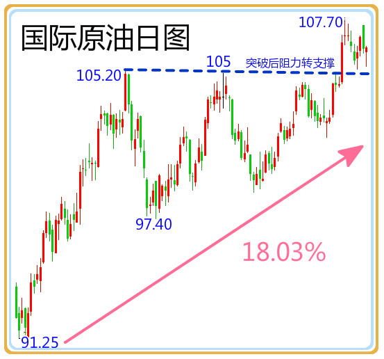从技术面来看,上述国际原油日图显示,油价年初见底于91.25美元/桶之后,展开持续上行走势,触及107.70美元/桶,累计上涨18.03%。油价目前已经成功突破105.20美元/桶和105美元/桶高点连线的压力线,并且转成短线支撑,油价若能震荡企稳于该压力线上方,那么多头将会剑指110-112美元/桶强阻力区域。