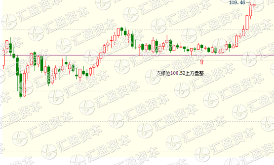 美日的走势也很强势,从周线图上也很明显,连续5周上涨,也是价格在突破形态之后的走势,同时也非常符合技术分析技巧,那么在操作思路上仍然以看多为主,但不要盲目追多。