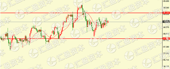 美元指数四小时图,从图形上来看,美元指数依据处在高位徘徊的区间87.80-89.10之内。投资者可以选择等待美元指数88整数附近选择进场看多美元指数。