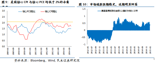 动态来看,不可否认的是,随着产出缺口的收窄,2015美国的通胀水平的确有上行趋势,耶伦也公开对外承认了这一点。但耶伦可能低估了油价对通胀的拖累。此次油价波动与以往需求端所触发的情况不同,而是交叉伴随着供给端的技术革命,以美国页岩油为代表的非常规油的供给上或将改写国际能源格局。不论在供需面、经济形势、地缘政治、美元指数方面,均对原油形成较长期压力,短期内油价很难回归高位。但目前来看,由于全球需求低迷、大宗商品价格持续下跌的预期强烈,所以市场上通胀预期再度弱化。近期10年期美国通胀保值债券的收益率已经从0.6%降至0.36%,处于较低水平。