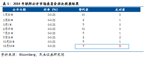 第二,美联储官员内部鹰鸽两派的分歧加大,。鹰派(以Fisher为代表)认为美联储是美国的美联储,没有必要深陷全球通缩的泥沼中,而应迅速回到有规律的干预轨道,认为在美国经济提升的展望下,应尽早加息;鸽派(以Narayana Kocherlakota为代表)认为美国应当承担更多的历史责任,目前通胀前景令人担忧,应以清晰的数字标准作为前瞻指引,过早加息将带来灾难性后果。12月FOMC会议反对票数为2014年8次会议来最高的一次,共计10名投票人,反对票高达3票,足可见内部分歧加大。
