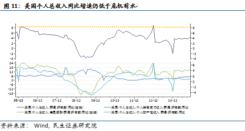 从劳动力市场的价来看:平均时薪与周薪同比涨幅均未达到危机前水平,同时正如通胀部分提及,美国个人收入恢复情况也并未完全达到危机前水平,主要原因是占比最大的雇员报酬同比增长依然低于危机前水平。