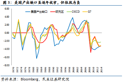 就业和通胀只是表象,背后反映的是产出缺口的变化,目前美国的产出负缺口并不支持过早加息。经济衰退时期,需求萎缩,产能过剩,供需失衡导致产能缺口大幅转负,表征为失业率飙升和通缩。而经济复苏时期,需求逐步恢复,产能逐步出清,供需再平衡导致产能缺口收窄,失业率随之下降,向自然失业率靠拢,通胀逐步上升,向均衡的通胀率靠拢。但产出缺口转正之后,失业率将降至自然失业率以下,经济将出现供不应求的过热局面,通胀会加速上升甚至失控,这正是央行需要通过收紧货币政策(比如加息)来给经济降温的时候。但目前来看,美国的产出缺口虽然连续3年收窄,从2011年的-4.2%收窄至-3.2%,但仍为负缺口,与2004年加息时有根本区别。而且,这一缺口也明显大于OECD国家的-2.3%和G7国家的-3.1%。经济复苏周期才刚刚走到中段,过早收紧货币政策恐怕导致经济二次衰退。